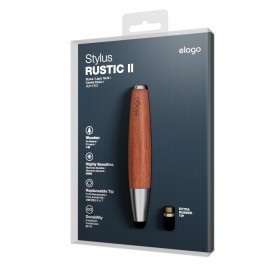 Elago Stylus Rustic 2 - это стилус вполне оригинальной, но от этого не менее удобной формы. Стилус выполнен из прочного твердого натурального дерева. Корпус имеет компактные размеры, комфортные для использования практически для любого размера кисти. Связующим компонентом, между резиновой насадкой и деревянным корпусом стилуса, стало довольно широкое алюминиевое кольцо. С противоположной стороны стоит металлическая заглушка из того же материала. Насадка обеспечит точную передачу нажатий на емкостной дисплей, не оставляя на нем следов царапин и потертостей. Наконечник съемный, а один запасной экземпляр идет сразу в коробке.
